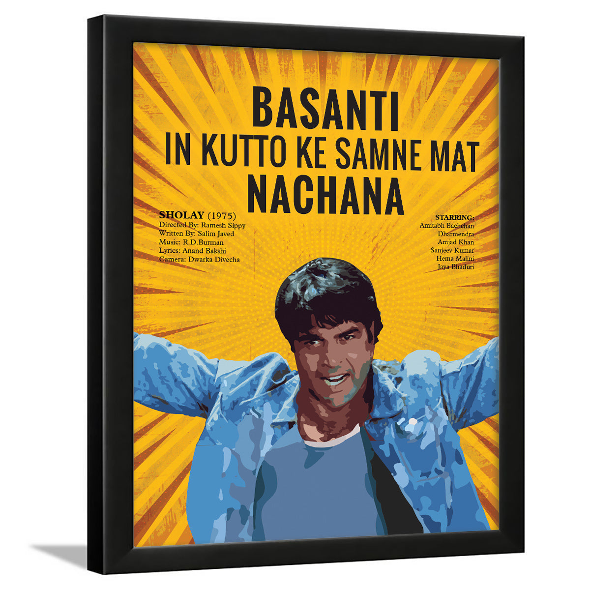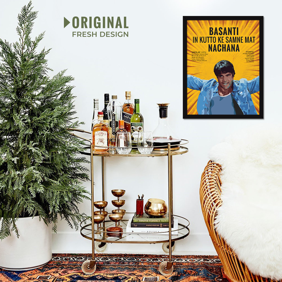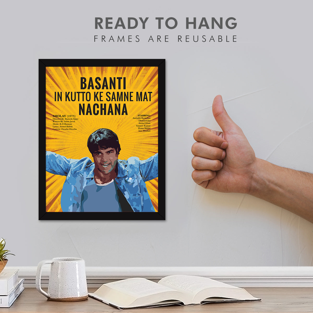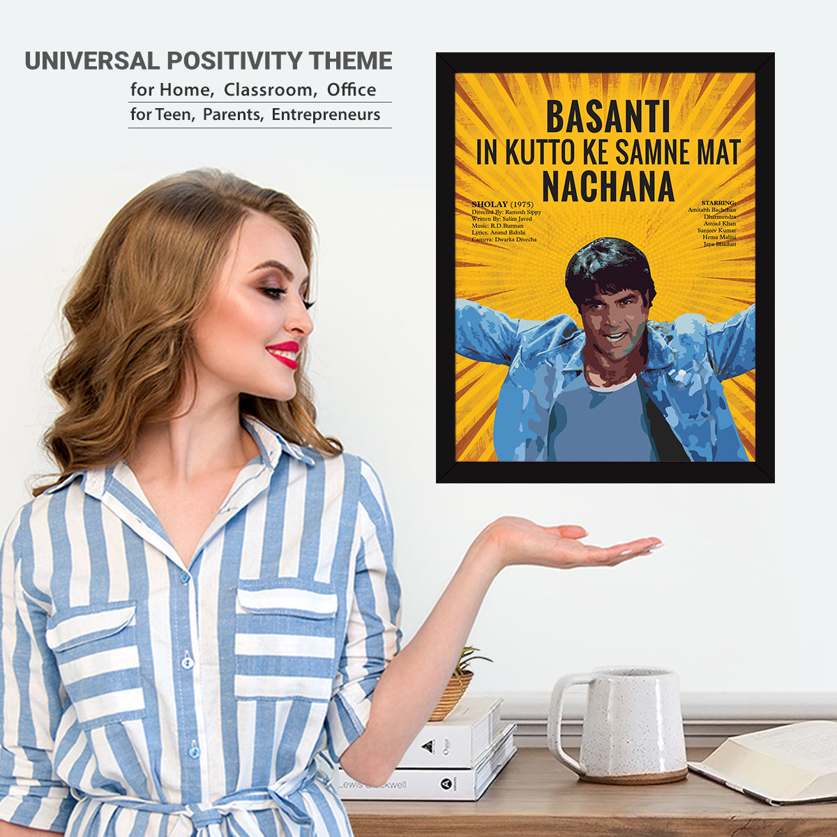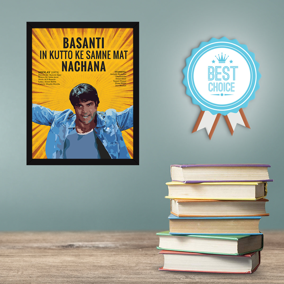 SHOLAY (1975) framed Poster - Bollywood Hindi cinema Dialogue Movies Poster - (14 X 11 Inches) - 【CREATIVE & MOTIVATIONAL FRAMED POSTERS】 Our Designers work on 4K Images, and 300 DPI (Resolution) vector graphics, and use the latest Print technology to deliver you the best vivid, sharp Artwork. Movies are a great source of entertainment, and everyone looks forward to seeing exciting film posters. So let your wall speak and entertain with this Bollywood dialogue Wall Hanging Quotes.